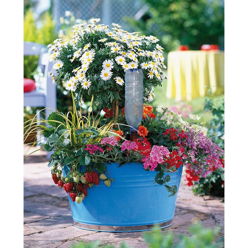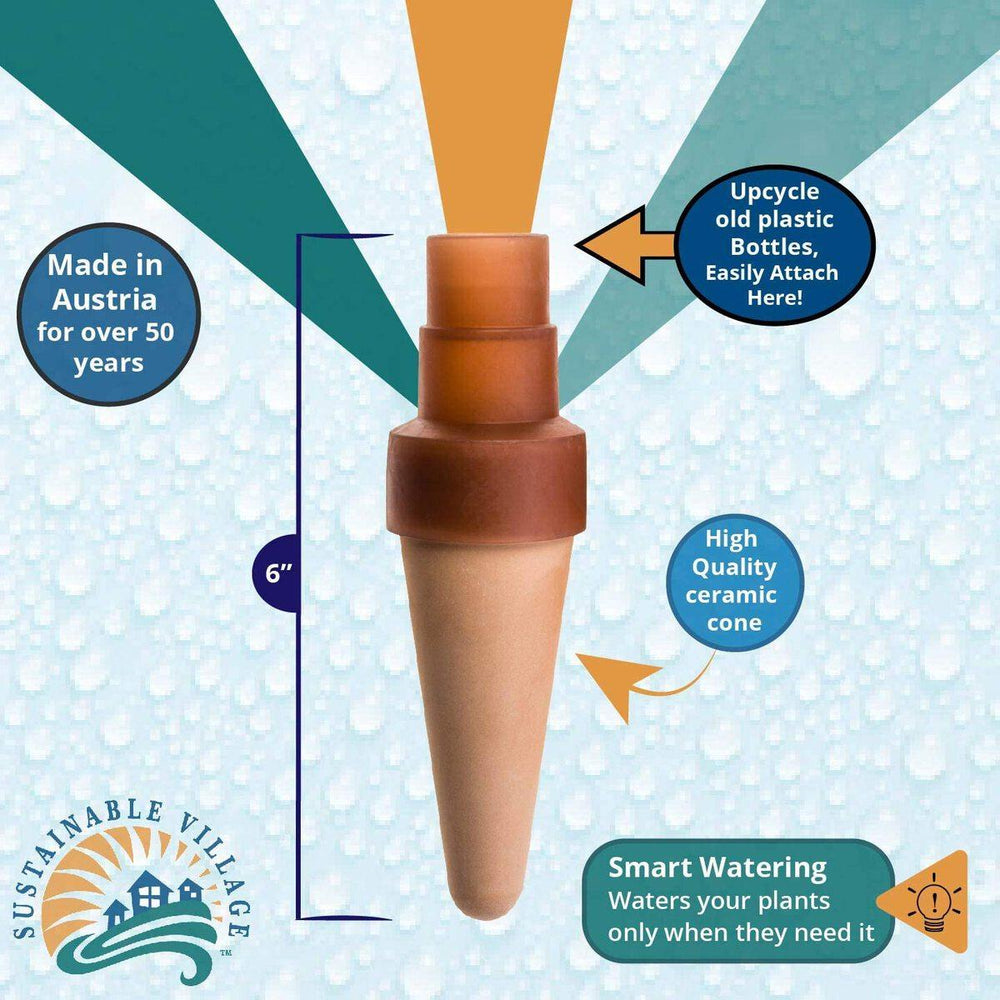 Much better than the wine bottle versions because Blumats are so much easier to refill: just cut the bottom off plastic bottle and fill with your regular watering can. (No reason to go back and forth from your sink so many times.) Better than the globe spikes because these disperse the water evenly, not just through a hole in the bottom. Just fit this adapter into almost any standard plastic bottle, fill the bottle with water and push into the soil near a plant. The porous cone will slowly start to distribute water throughout the day.